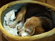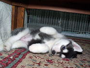 バルトの横着さ●バルトのお引っ越し完了。一日中を追いかけ回して遊び、夜は一緒に眠り、2日目とは信じられないやんちゃぶり。すっかり我が家気分で、大の字になって無防備に寝るしまつ。●おしっことウンチはサークルの中の新聞紙とトイレシーツの上でしっかりとするので、世話なし。サークルの奥は寝室、入り口は食堂と遊戯室の2DKにしたが、全部にトイレシートを引いたものだから、全室トイレに変貌。もよおすと、すたすたとトイレに入って用足し。 |