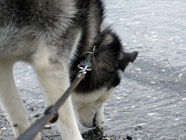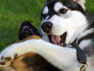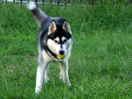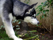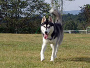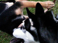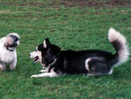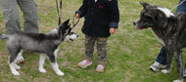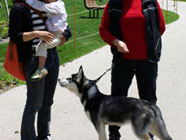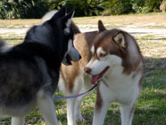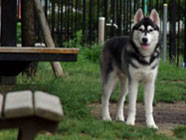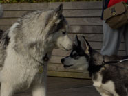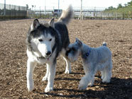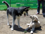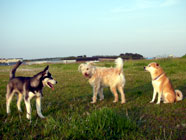 | ムサシがデビューした公園へ。ムサシの後輩で幼友達の友達のハスキーのソニーに出会い、じゃれつく幼いバルトを快く受け入れてくれました。 | 秋田犬の大和君に挑みかかるバルト。遊びたい一心とはいえ、先輩を敬わず、怖いもの知らずの横着三昧。厳しいしつけ開始時期。 | ムサシのお友達のモコちゃんと会いました。バルトを優しく迎えてくれました。「跡継ぎなのか」と彼女はムサシと初めて出会った頃を懐かしんでいるようでした。 |