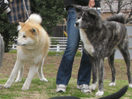 秋田の赤兎馬公園デビュー直後、秋田犬の栗毛の大和と白の赤兎馬(せきとば)に出会いました。迫力抜群の二頭を連れてのお散歩勇姿は、勇猛な軍馬、赤兎馬を乗りこなした呂布か関羽かと見まがい、周囲の驚嘆を引き起こしていました。 |