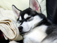 なかなか剛胆なバルト●お家について「ここどこ」ときょろきょろしたが、すぐ落ち着き、くまなくチェック。お食事タイムにはいると、これも心配をよそになかなかの食べっぷり。夕食もしっかりと済ませ、給水器からのお水の飲み方もマスター。夜は疲れたのかぐっすり眠り、初めての夜のお家とは思えない落ち着きぶり。旅犬の素質は十分。なかなかの気の強さ。 |