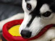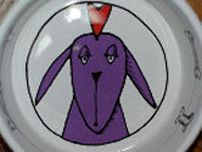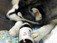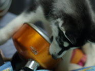 洪水の原因バルトの飲み水入れはムサシが愛用していた食器。 底には犬の絵が描いてある。いつ頃からか、バルトは、その絵に興味を持ち、ちょっかいを。 遊びを誘っても相手にしてくれないので水掻き撒水。 |