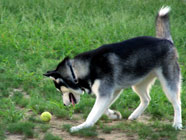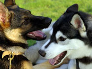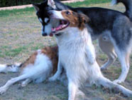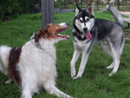 お友達と 11.25ドッグランで公園レビュー直後のボルゾイと生後6カ月のハスキーと戯れるボルゾイのお兄さんと会いました。シェパードのメイはボールを横取りするバルトの横でお淑やかにフセをして見守るだけ。 |