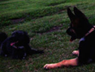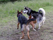 ムサシのお友達 08.27ドッグランでランディと戯れました。ランデイは弟を亡くし哀しみにおちいり、寂しげでした。 でもバルトの前ではつらさを見せず、相手をしてくれました。 |
