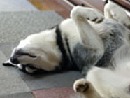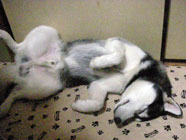 夜鳴きに完敗。ごろ寝。熟睡。気がつくと、朝9時。バルトはへそ天で爆睡。聞けば、バルトは、夜中に、ばたばたと騒いでいたよし。夜鳴きで2階から引き下ろし、そばで寝静まったのを確認して遊んでいた様子。で、夜遊びに疲れたバルト。今朝は朝7時前後の「ワン、さんぽ」なしのぐうたら寝。 |