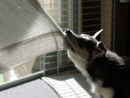 | 何だって僕のおもちゃ。おもちゃ ハンター。 | テーブルから引きずり落としタックル。 | ひらひらと風になびくカーテンに興味 |