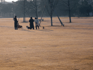 静かなひととき朝靄の公園です。愛犬とお友達との穏やかなひとときが流れています。バルトは菜の花を見つけて語らいを始めました。日も長くなったように感じます。 |