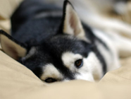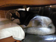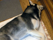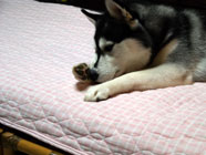落城です階下からキューン、キューン。バルトのテンション昂揚に抗しきれず階下に引きずり下ろされ、毛布にうずくまって野営状態。 朝には足下の布団の上にドタリと陣取りスヤスヤと寝息。 ついに落城。 |