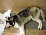 グロッキー気温急上昇。気象情報を手にせずに走り回りついにダウンの図。こうした日は、夜の追加おさんぽが終わると、あっけなく玄関でごろ寝体制に。 |