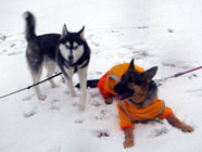 雪が降り積む待ちに待った積雪。完全防寒対策で公園へ。雪の中で遊ぶメイちゃんとバルト(めいチャンまま撮影) 夕方は、ドッグランで、ボルゾイのランディとロンとも大はしゃぎ。 |