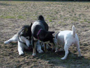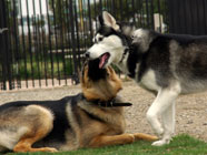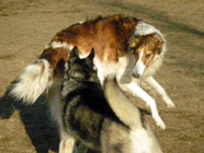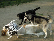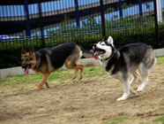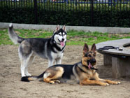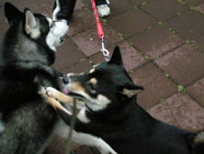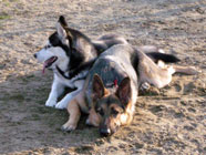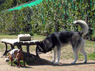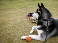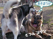 横着なやつお昼過ぎにドッグランに出かけたところ、メイちゃんがすでに遊んでいました。バルトは、休んでいるメイちゃんの脇腹を前足でつついて遊びをうながす始末。実に横着者なのです。 |