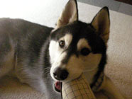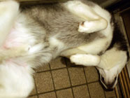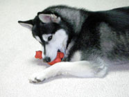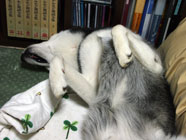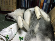 バルトヘソ天ノビノビハスキーグッズを机の上でころがしていたら「なに、なに」とバルトが駆け寄り、目がまん丸。横にして身体をくまなく探ると、なんと、バルトのヘソ天ノビノビそのものでびっくり大笑い。肉球がかわいい。 |