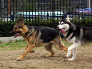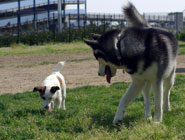 気のいいパッチ君パッチのボールを狙っているバルト。パッチは始終動いているのでなかなか撮れなかったツーショットをドッグランでついに成功。パッチは3歳のジャックラッセル。 |