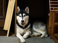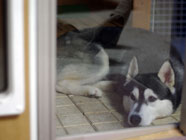 気まぐれに潜り戸を抜けて、バルトが庭にある彼の別荘でおくつろぎ。春になり、気温が上がったためかもしれません。ハスキーは敏感、季節の移ろいに。 |