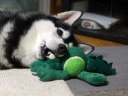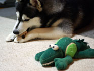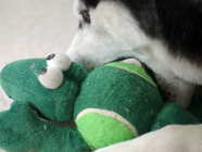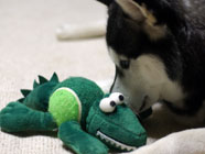 新しい仲間ワニに手こずるバルト。咥えやすい窪みがあるボールに興味を。ムサシは全くと言っていいほどボールなどに興味を示さなかったので、個性の違いに感心し、おもちゃに果敢に挑戦するバルトを観察しているこの頃。 |
