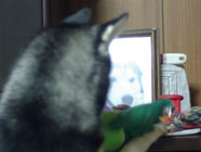 ムサシのお許し遊びを誘いに来るので「ボールもってこい」「おもちゃを持ってこい」と命令すると、ムサシの写真の前に並べてあるおもちゃたちの中からお気に入りを物色。ムサシに許しを求めているようでおかしいのです。 |