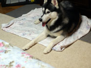 ナプキンのつもりママおみやげの馬爪を歯が欠けるのではないかと思うほどの音を立ててバスタオルの上で格闘。ナプキン代わりにしているつもりなのか。 |
