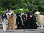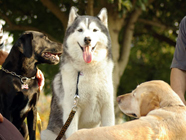 「ムサシやどっさりのお友達と出会ったら、バルトはとてもいたずらだよと伝えてくれよ」。「いつになるかは約束できないけれど、また会えるから、元気でいろよ」。さよならは言わずに見送りました。海が望める公園予定地に市にお願いしていた動物愛護の碑ができあがりました。「ありがとう」「やすらかに」と刻みました。 | 公園でソニーとリュックに話しかけているクロラブはリュックの娘のジィーナ。左は 大あくびをしているソニーをみつめるムサシ。ハスキーはおしゃべりですからウルサイとリュックに叱られているかもしれません。散歩途中にジィーナに出会うと「時を感じるね」などとつぶやきあいながら相棒たちが足並みをそろえるこの頃。 |