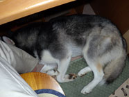 バルトの要求で模様替え窮屈そうに寝返りを繰り返すバルトの要求に応えて、机を移動して向きを変え、作業中でもバルトが足もとでのびができるように模様替え。バルトのお腹の下に素足を差し入れておくと、床暖房よろしくほかほか。 |