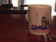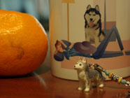 背後霊ムサシをデザインしたカップを背景にして、いただいたハスキーのおみやげを撮っていたら、背後霊の如くバルトが睨みつけておりました。なんだか不思議な取り合わせになりました。 |