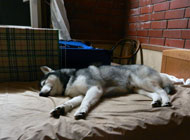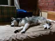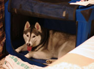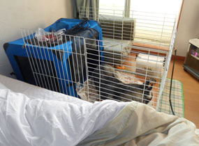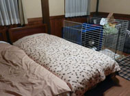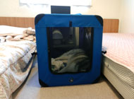この日の宿泊先はいすみ市にあるペンション「Ring Woodfield」。 夕刻の到着になり、ドッグランでの追いかけっこと手足の屈伸は食後の楽しみにしてゲストルームへ。 このペンションでは犬をベッドに乗せられないので、荷下ろしの最初に設えた居室「ソフトケージ+ダイニング」に入れられたバルトは「なんで」と不満顔し、荷下ろしの間はふて寝。 |