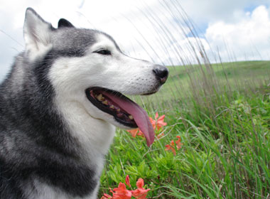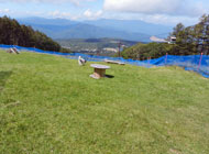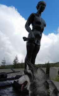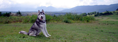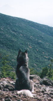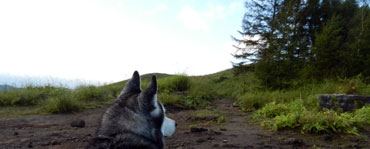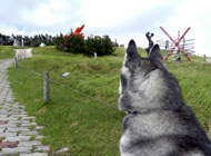 | 宿泊したペンションそばの森の中には200坪ほどのドッグラン。 ムサシとトレッキングによく出かけた茶臼山方面へ。国道では二番目に高いという2000メートル級の麦草峠に着くと、強い風と霧雨に変わり、バルトの身体は水滴に包まれしっとり。 雨嫌いのバルトは登山道分岐の道標の前で進みあぐねている様子なので、霧ヶ峰方面に予定を変更。峠下りにさしかかり遠くの見晴らしが利き始めた先の霧ヶ峰方面は晴天。 |