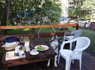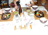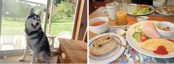 夕食後にバルトは芝を張った600坪のドッグランで思い存分ランざんまい。 森の中にある、野原のようなドッグランと木造の建物が手を取り合って息づき、1日5組のみというこのペンション。壁には珪藻土(けいそうど)を塗り込み臭いを吸収させる気遣いよう。木造りにこだわった建物だけに、芳しい木の香りが満ちている。 建物から椅子、テーブルまでオーナーの手造り。食器やナイフやフォークなども使いやすいものにこだわり、宿泊者に安心安全を提供する心意気があふれておりました。 |