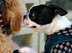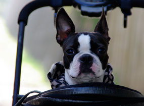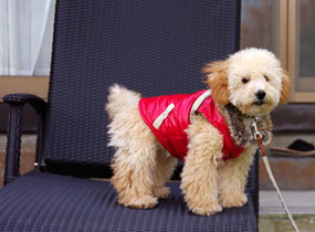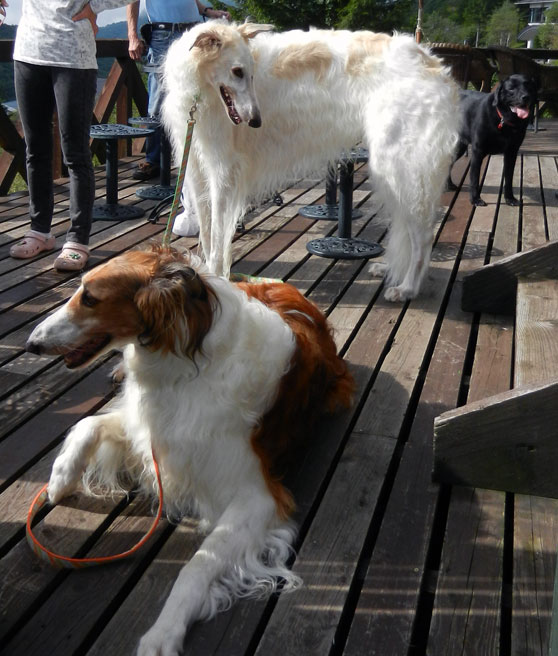 | ペンションで知り合ったトイプードルのぷーちんは生後5カ月にもかかわらず、とても利口で、食事中もワンとも言わずお座りを維持。ボストンテリアのまるは4輪車の中でいつも静か。 バルトは裏玄関でスタート待ち。 |