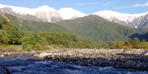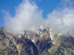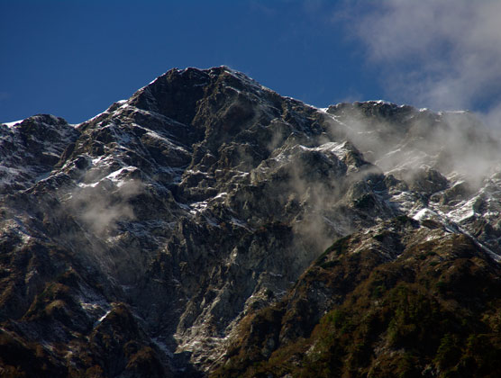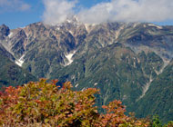 糸魚川からは松本方面への国道に入り、1時間ほどで白馬の里へ。 この時期には珍しい夏日の暑さながら、後立山連峰の稜線は冠雪し、くっきりとした岩峰が存在を誇示。 高鳴る胸を押さえながら白馬村へ。紅葉最盛期にはまだ早いが、夕刻になると気温が下がり、身震い。 陽が落ちはじめ、夕暮れ近くになると、里は秋色の気配を濃くし、バルトには快適。 |