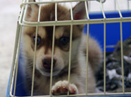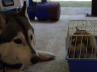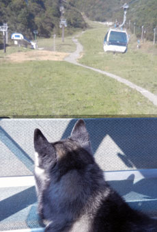 ボールをキープして動こうとしないバルトのお尻をたたいて車に追い込み、小布施へ。小布施に向かう道路脇には果樹園が連なり、ついつい道草して葡萄などの買い込み。小布施の町では、旬素材の無添加ジャム、老舗和菓子店で季節限定の栗最中、上質な国産ワイン造りに励んでいる小さなワイナリーでワインを数本買い求め、気をよくして菅平に向かう途中の峠から雨脚が強まりワイパーがフル回転。 休憩は諦めて宿泊ペンションへ。 キャベツ畑が広がる嬬恋村界隈に近づくにつれて雨脚も弱まり、バルトはペンションのドッグランでようやくの大休憩。ドッグランの点検と手足の屈伸を済ませたバルトをゲストルームへ。 荷下ろしの間ケージに入れられたバルトは、今夜の待遇を思案するかのように、出入りする相棒の動きをチェック。 |