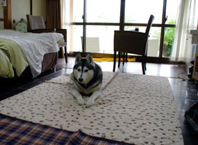 いすみ市からは勝浦などの海沿いに出て潮風をたっぷり吸い込み、地魚の寿司などを楽しみながら宿泊予定の「しぶごえ館山弐号館」へ。 予約した海と緑地公園側の部屋、室内から直接外に出られる1階の洋室。 室内備えつけの大型ケージにバルトを待機させ荷下ろし。少し離れた駐車場に車を移動させる必要もあってか、数人のスタッフが手を貸してくれるので大助かり。 犬がベッドの上に乗ってもかまわないというので、持参のカバーをベットに掛け、シートを板間に敷いてバルトをケージから出すと、待遇を察知したバルトは「今日は一緒に寝てもいいのかな」とばかりに安心滞在スタイルでリラックス。 夕食はおいしくボリュームのある和食懐石料理。もちろん犬同伴。 この時期の平日なのにレストランは満席に近い状態。スタッフには愛玩動物飼育管理士などもいて、みんな動物好き。 誕生月のビジター犬にプレゼントなどもあって、なごやかな夕食タイムになりました。 |