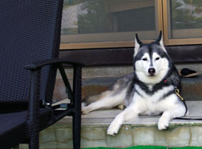 ペンションで知り合った小鉄。朝日を浴びて共にリラックスタイム。 バルトの住まいの街区に柴犬の小鉄君がいます。ムサシのお友達でした。 |