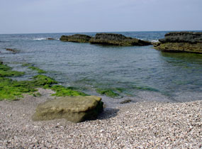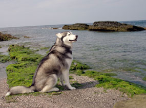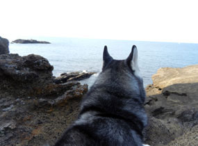 北陸道糸魚川ICで高速を降り、日本海の眺望を楽しもうと海岸へ。波が穏やかに打ち寄せ、足がわずかに沈むならされた砂浜でバルトが身を丸めて勢いよく砂堀りし、大はしゃぎ。 やはりしたたかな日本海。砂遊びに夢中になっていたバルトは、いきなり大波に叱られてずぶ濡れになり、その迫力に仰天。恐れをなし、遠くからの海原見物に切り換え。 |