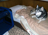 しっかり造られた山荘風のペンションには2泊の予定。ゲストルームはツインのベッドルームとリビングルームが二間続きになっていて、ゆったり。 ただ、通路が狭く低いので、通るたびに頭をぶっつけ、不注意の責任はこちらにあるとはいえ、閉口。 この数日は車中泊などで独り寝だったバルトは、ベッドの間にセットされたソフトケージに大喜びし、シーツにあごを乗せておさまり、一緒に眠れると一息ついている気配。 一眠りし、夕食を終えた後には、ベッドに乗せろと言い張り、要求を受け入れるまでひとあがき。 |