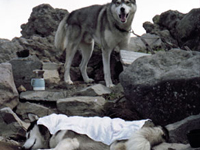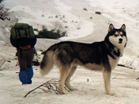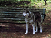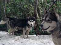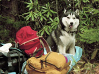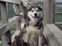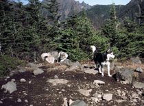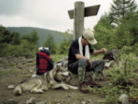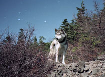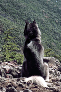 | 犬友だちハスキーのシロ武蔵と韮崎の甘利山を訪れ、翌日は八ヶ岳連峰の西岳登山にでかけました。 1歳年下のシロ武蔵を先導するようにして兄貴ぶるムサシの振る舞いがおかしく、笑いながらの楽しい山登りでした。 2千メートルを超す稜線で「次はあの山を踏破するぞ」と闘志を燃やしているかのようなムサシでした。ばかりに |