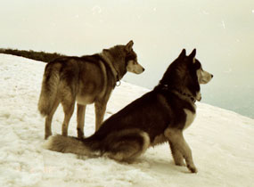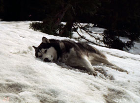 | 住まい周辺はバルトが散歩を嫌い始める初夏ですが、まだ雪が豊富だというので上越方面に出かけました。 中腹まで残雪の手のひらが伸びていて、人と会うこともなく、ムサシとジョンは身体を冷やしながら心地よい山歩きを楽しんだようです。 残雪の山脈に見とれる2匹。 |